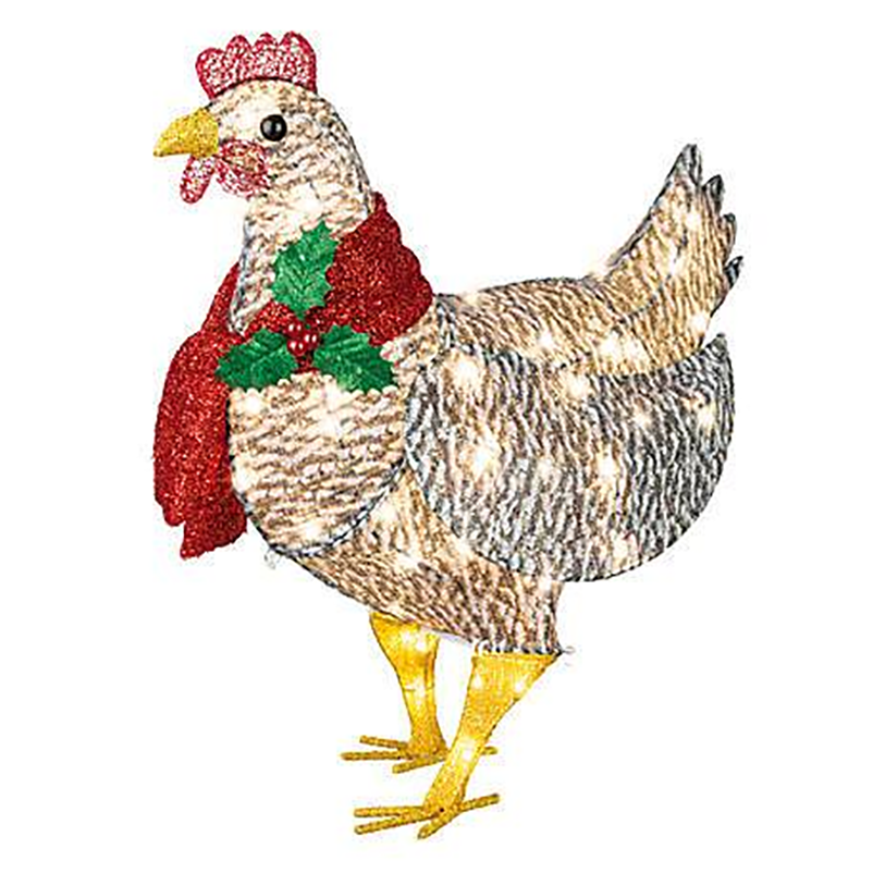 Get in the spirit of giving with this Light-Up Chicken with Scarf Holiday Decoration. This lovely holiday decoration has an adorable mistletoe scarf that just radiates wholesomeness.Its built-in lights are sure to dazzle and amaze the entire neighborhood.Don't worry about leaving your chicken in the cold; this outdoor decoration is built for weeks outside in winter weather.DETAILS