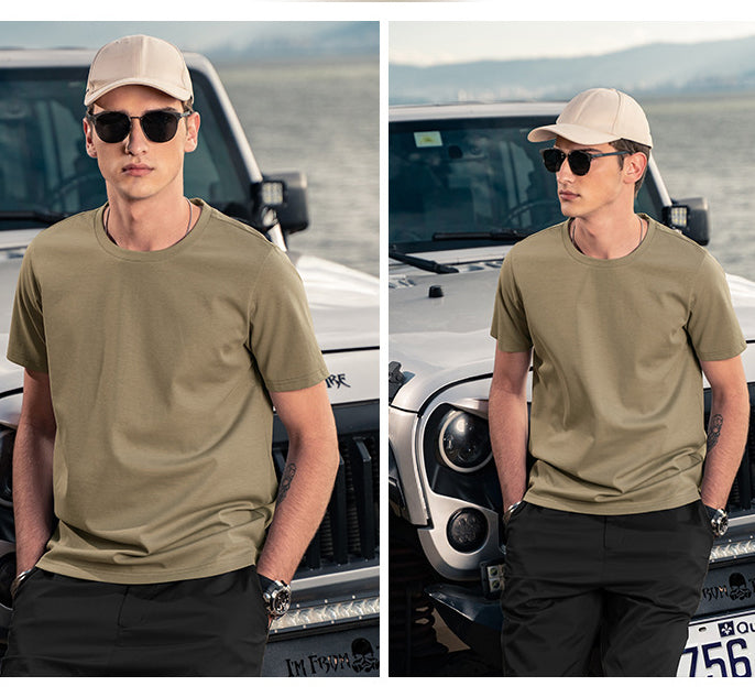 The men's plain-coloured frost silk T-shirt has a classic crew neck design and a breathable and cool frost silk material, providing you with unparalleled comfort. Our T-shirts are available in various sizes and fit all shapes and needs.
